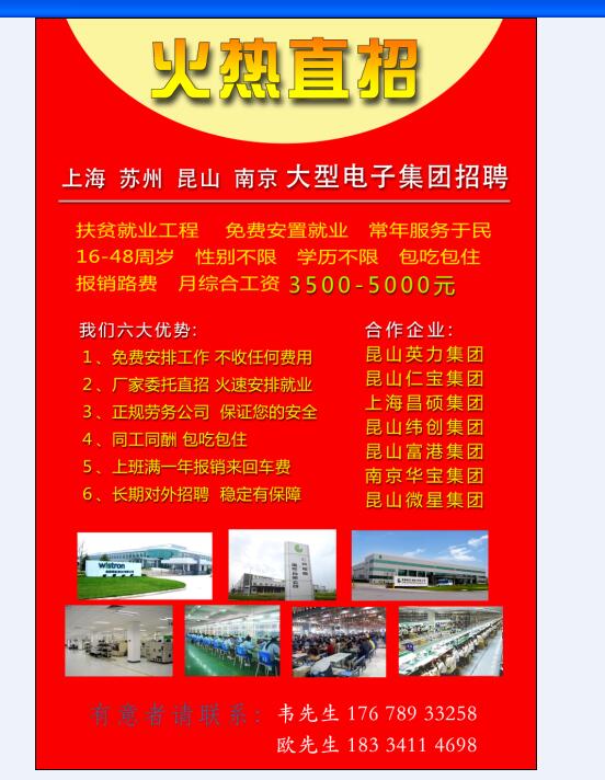 > 上海 苏州 昆山 南京大型电子厂火热直招